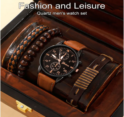 New Men Watch Luxury Bracelet Set Fashion Business Brown Leather Quartz Wrist Watches for Men Gift Set Relogio Masculino